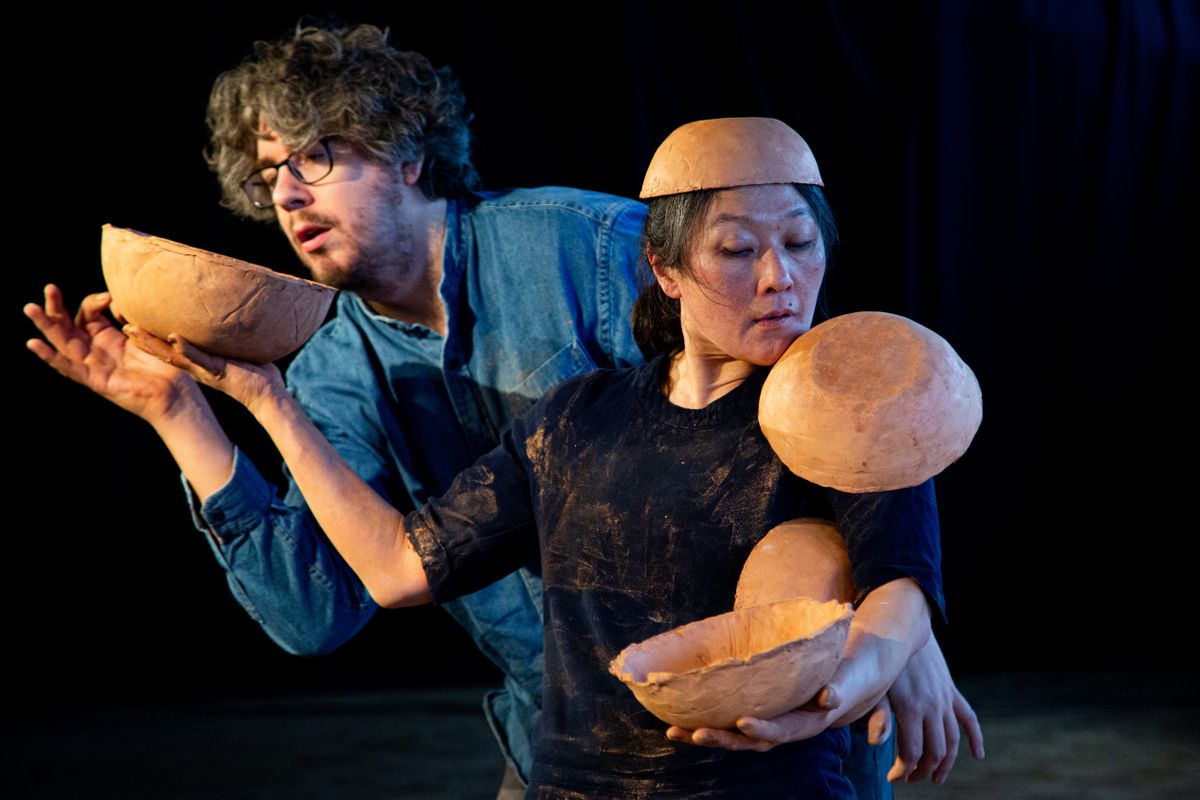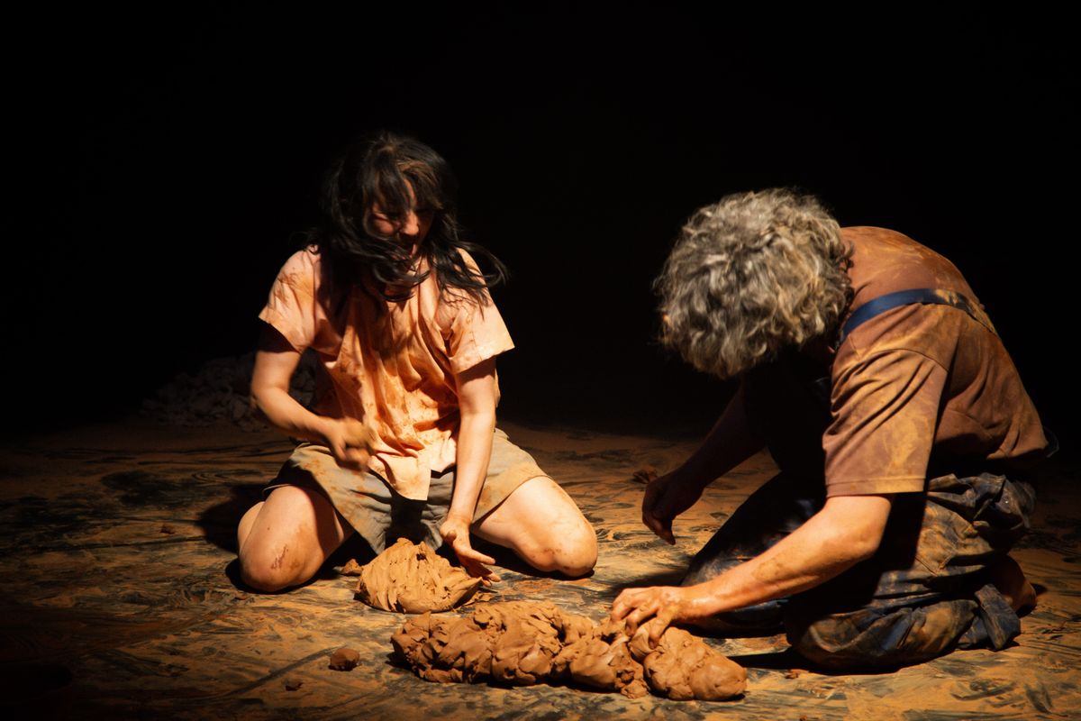 Een dialoog tussen een danser en een drummer zonder drums, dat is Alter. Klei, dat is het materiaal waarmee ze aan de slag gaan. Ze spelen, dagen uit, kneden, voegen water toe, maken vormen, ze veranderen en bewerken de klei totdat het hele podium een groot landschap vormt. Als je goed kijkt, zie je daar ook steden, wegen, rivieren, bergen?