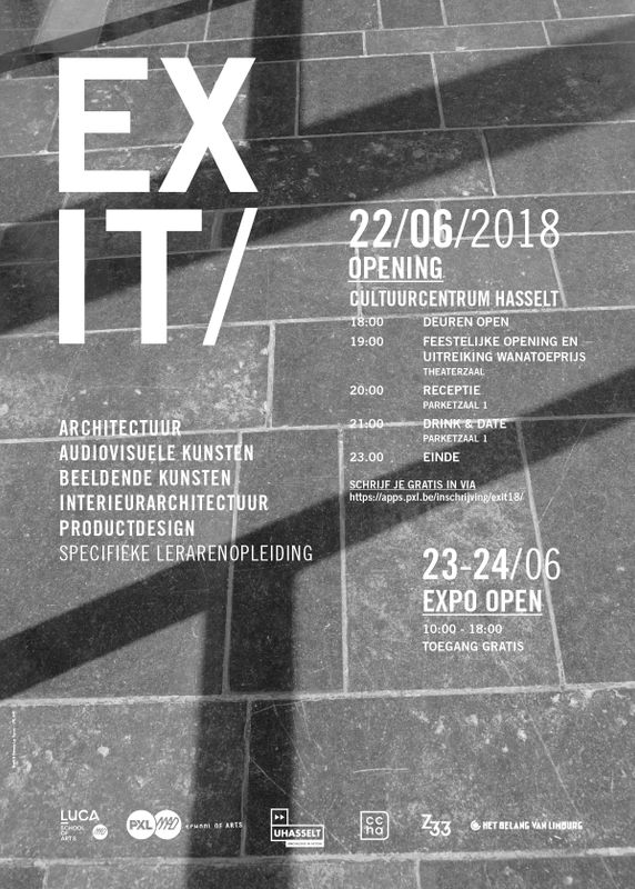 EXIT bundelt de afstudeerprojecten van de masters van PXL-MAD School of Arts, LUCA School of Arts Campus C-mine Genk en de faculteit Architectuur & kunst van de Universiteit Hasselt.