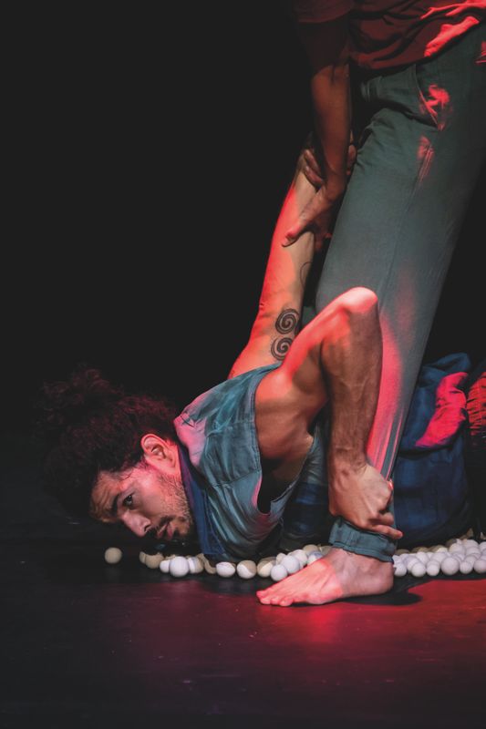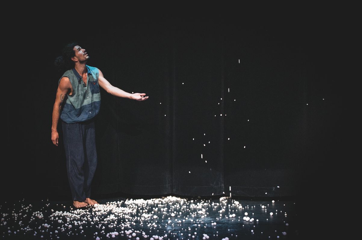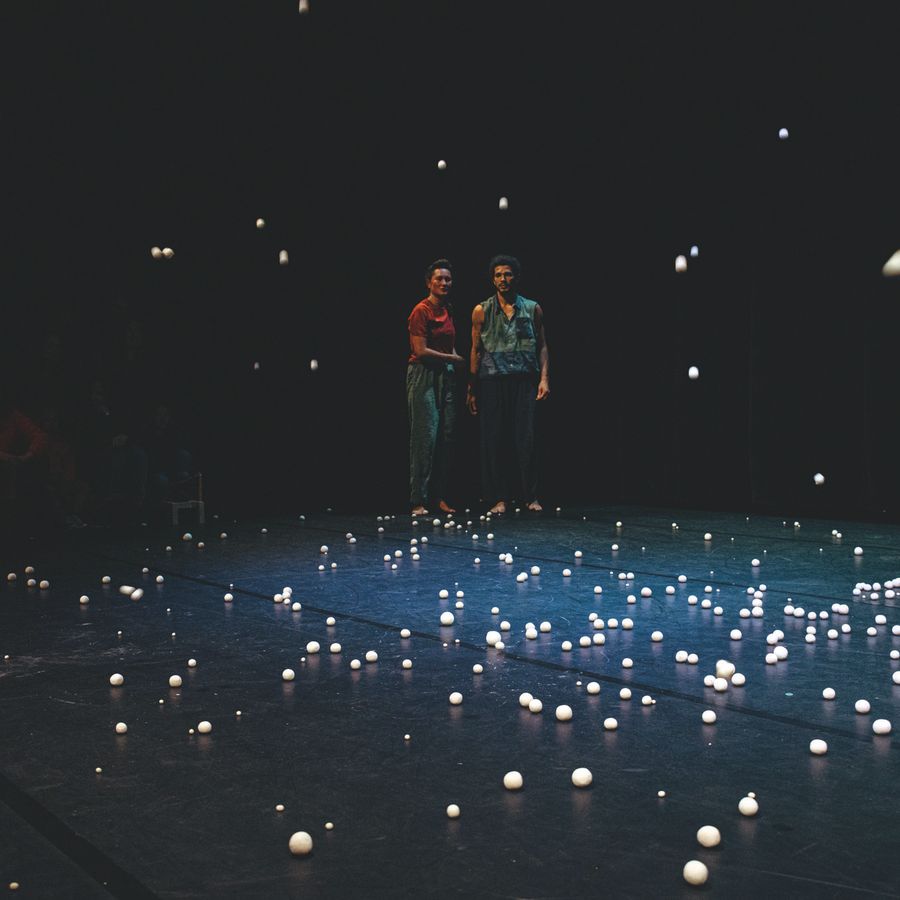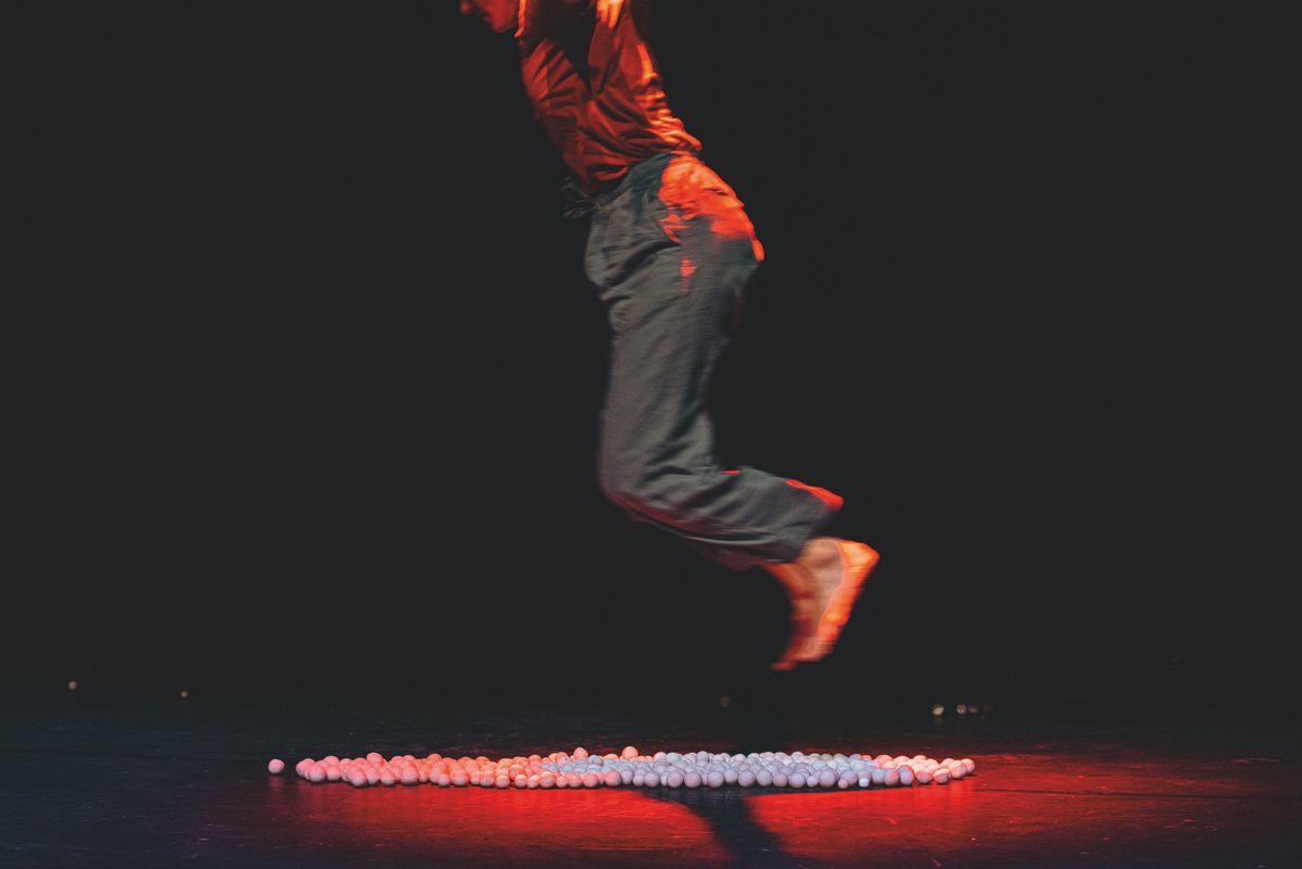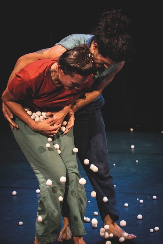 Een massa witte keramische balletjes overweldigen twee acrobatische spelers. Ze zijn verre van perfect: net niet helemaal rond, net allemaal ongelijk en ook met veel te veel. Ze rollen drummend in het rond, springen alle kanten uit, bruisen plots op in een mond of plakken onherroepelijk vast aan het plafond.