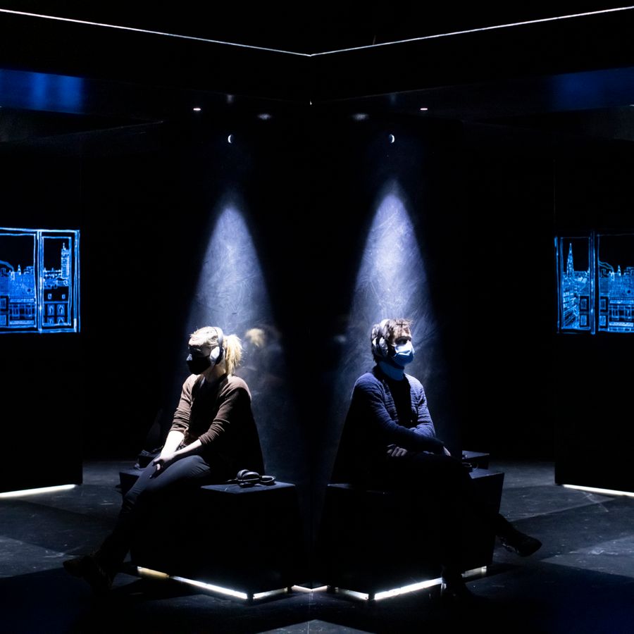 Fien Leysen, die bij ons nog te gast was met haar voorstelling Wat (niet) weg is (CCHA, 2019) en scenograaf Manu Siebens (bekend van zijn werk bij de gezelschappen BERLIN en MartHa!tentatief) werkten samen aan deze indrukwekkende installatie die focust op audio en tegelijkertijd prachtige tekeningen (van de hand van Tom Clement) projecteert.