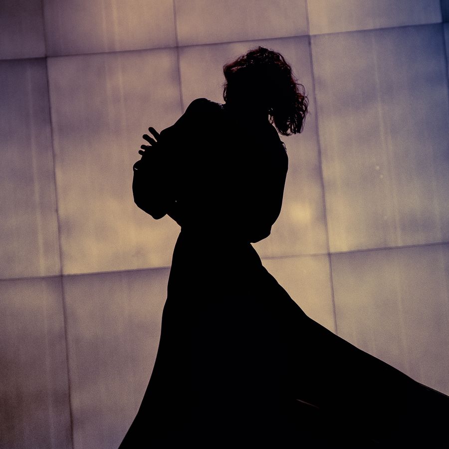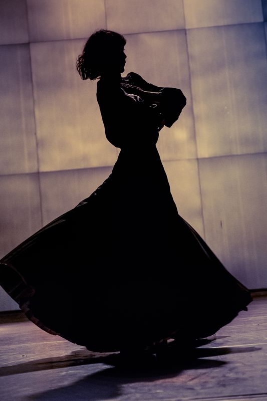 Helemaal alleen, voortgestuwd door de repetitieve, hypnotiserende en opzwepende muziek van Maarten Van Cauwenberghe, gehuld in een lang zwart wapperend gewaad en steunend op haar rechtervoet, cirkelt, dwarrelt de danseres in het rond als een levende tol en drukt ze zo de verwachting, het verlangen, de onmacht, en al het lijden uit van de vrouw. Als een soort contrapunt willen ze samen de tijd (voor even) laten stollen.
