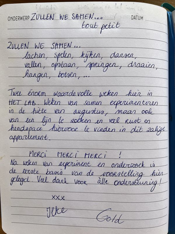 In deze residentie zal tout petit hun laatste maand voor de première inzetten. Er zal intensief geëxperimenteerd worden met dans, scenografie en muziek.