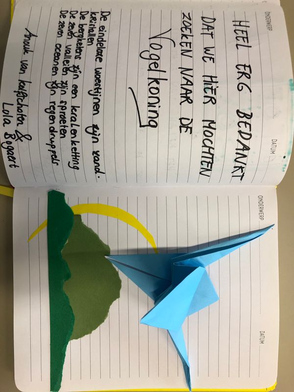 Stel je voor: een grote tafel. Als je goed kijkt, zie je dat er op de tafel een andere wereld opgebouwd wordt. Een wereld die wordt gemaakt uit normale dingen en tóch lijkt er iets speciaals aan. Flesdoppen worden vijvers en luciferdoosjes worden huizen. Je schuift naar het puntje van je stoel en laat je meevoeren met het verhaal van de vogelkoning. Vallei na vallei ontvouwt zich, een wereld in een wereld in een wereld toont zich aan jou. Als een ui die geschild wordt zonder dat je tranen krijgt. De vogels gaan op reis en jij mag mee.