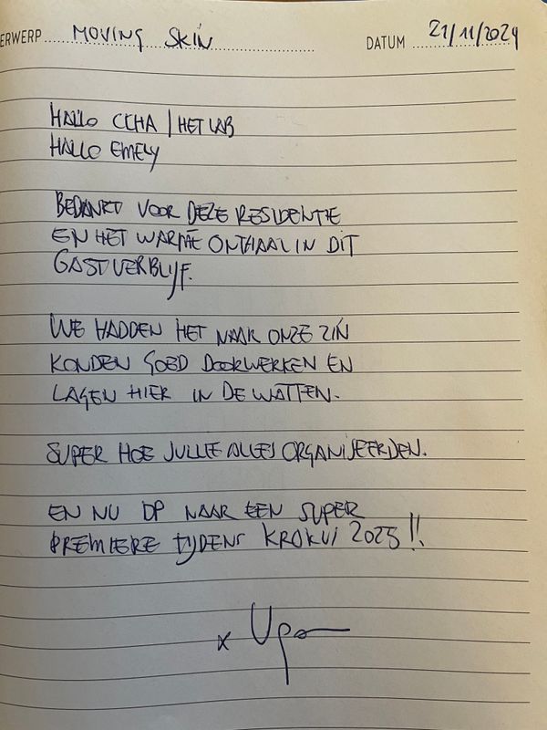 Tijdens deze residentie experimenteert hij samen met geluidskunstenaars Wannes Deneer met het maken van siliconen vellen en hoe die ingezet kunnen worden als luidsprekers voor de muziek van de voorstelling.