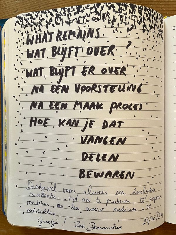 Tijdens de residentie zal Zoë Demoustier zich richten op het verwerken van beeldmateriaal en geschreven of getekende documentatie uit het creatieproces van What Remains. Dit werk vormt de basis voor een eerste versie van een mogelijke publicatie. Daarnaast zal Zoë werken aan een verkorte filmversie van het materiaal. De uitkomst van wat zij in deze residentie creëert, biedt enerzijds een inkijk in het creatieproces en probeert anderzijds elementen uit de voorstelling vast te leggen in nieuwe vormen en media. Zo worden de vluchtige en tijdelijke aspecten van de voorstelling omgezet in blijvende documentatie die later opnieuw kan worden doorgegeven.