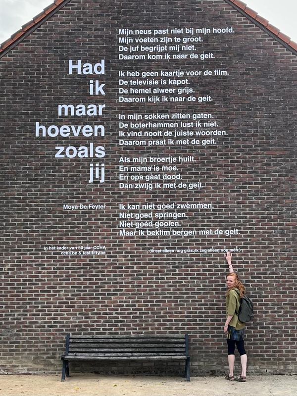 Vanaf 28 aug 2022 gaf dichter Moya De Feyter extra smaak aan Hasselt. Een stad met poëzie op de muren is een stad die ademt, is een stad van de toekomst. Naar aanleiding van de 50ste verjaardag van CCHA schreef Moya De Feyter vijf gedichten die zowel in de stad, als in de natuur terechtkomen. Drie van de vijf gedichten kan je nog bezoeken: kinderboerderij in Kiewit, aan bushalte Leopold en de gevel van CCHA.